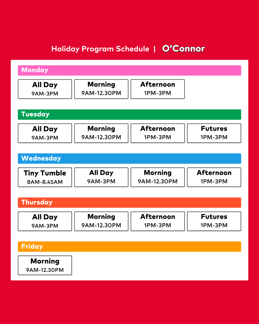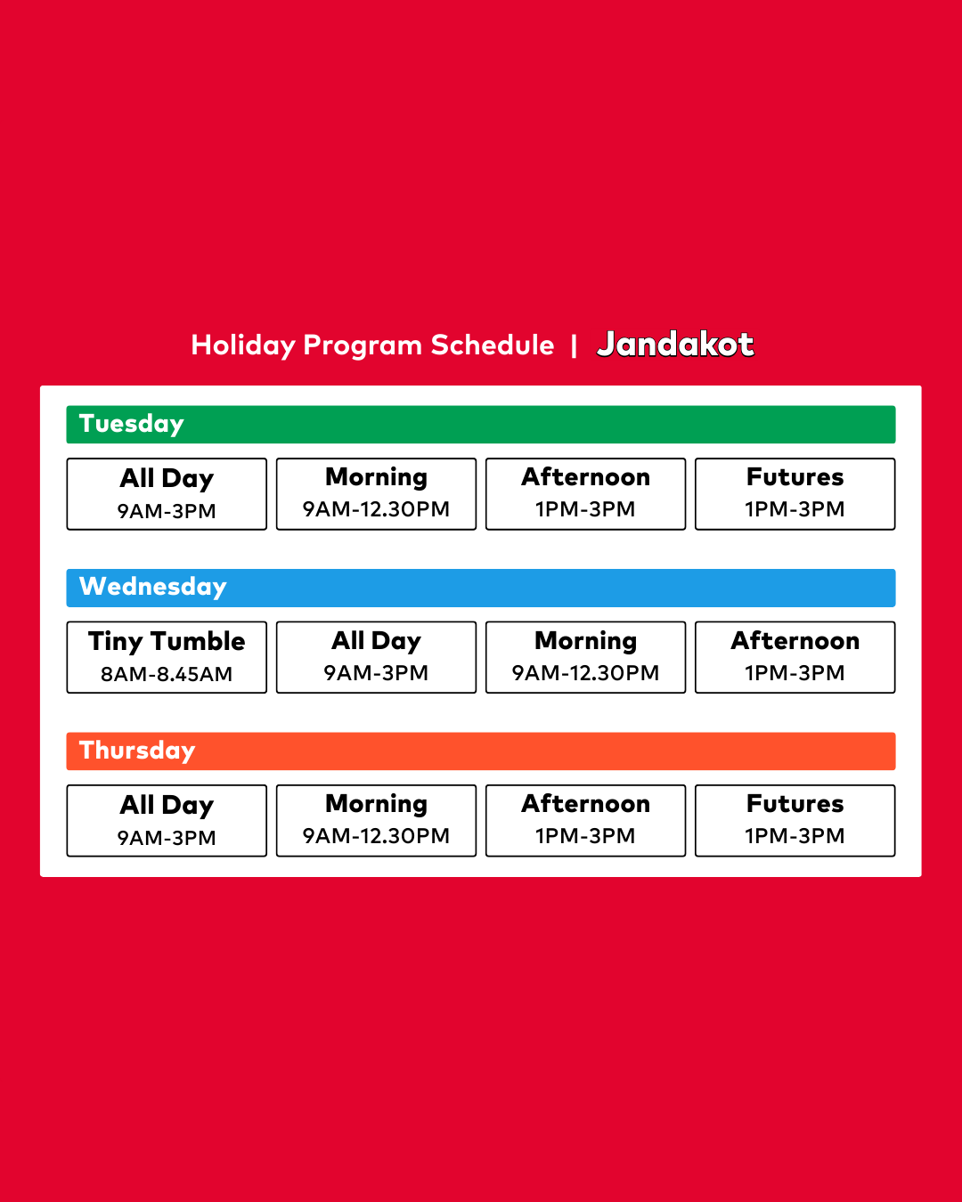 Our Tiny Tumble Classes are 45 minutes, and children are grouped by age (2-3yrs, 3-4yrs and 4-5yrs).